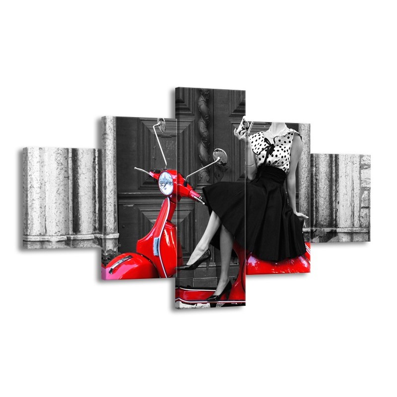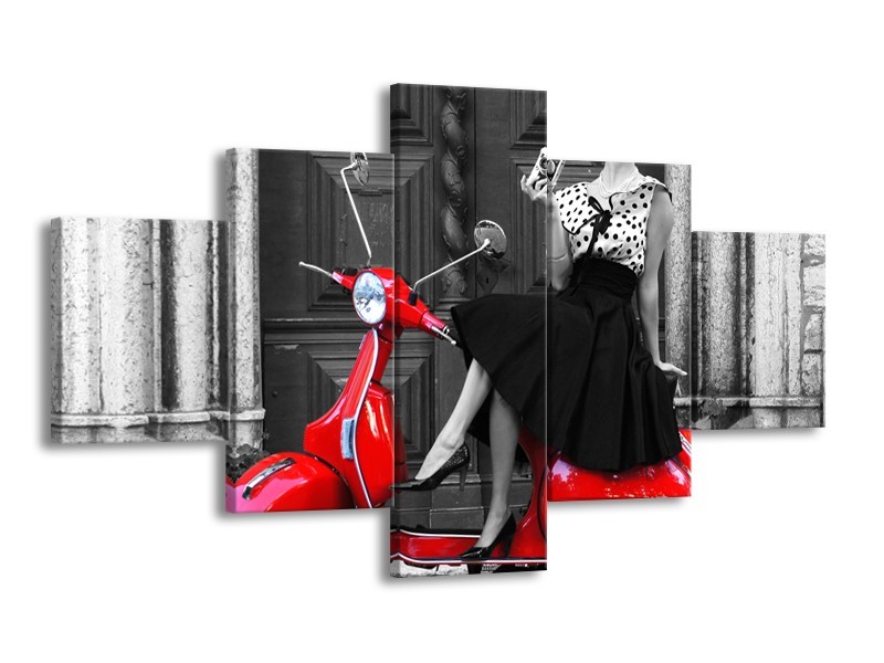 Glasschilderij Scooter, Vrouw | Zwart, Wit, Rood | 125x70cm 5Luik
