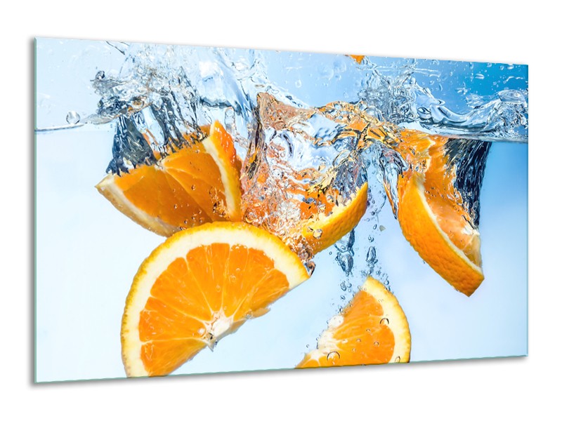 Glasschilderij Sinaasappel, Keuken | Geel, Blauw | 120x70cm 1Luik