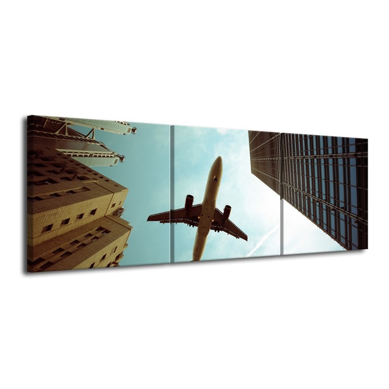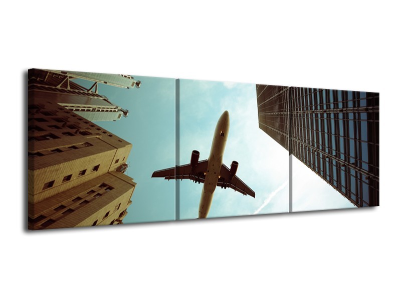 Glasschilderij Steden, Vliegtuig | Groen, Blauw, Grijs | 120x40cm 3Luik
