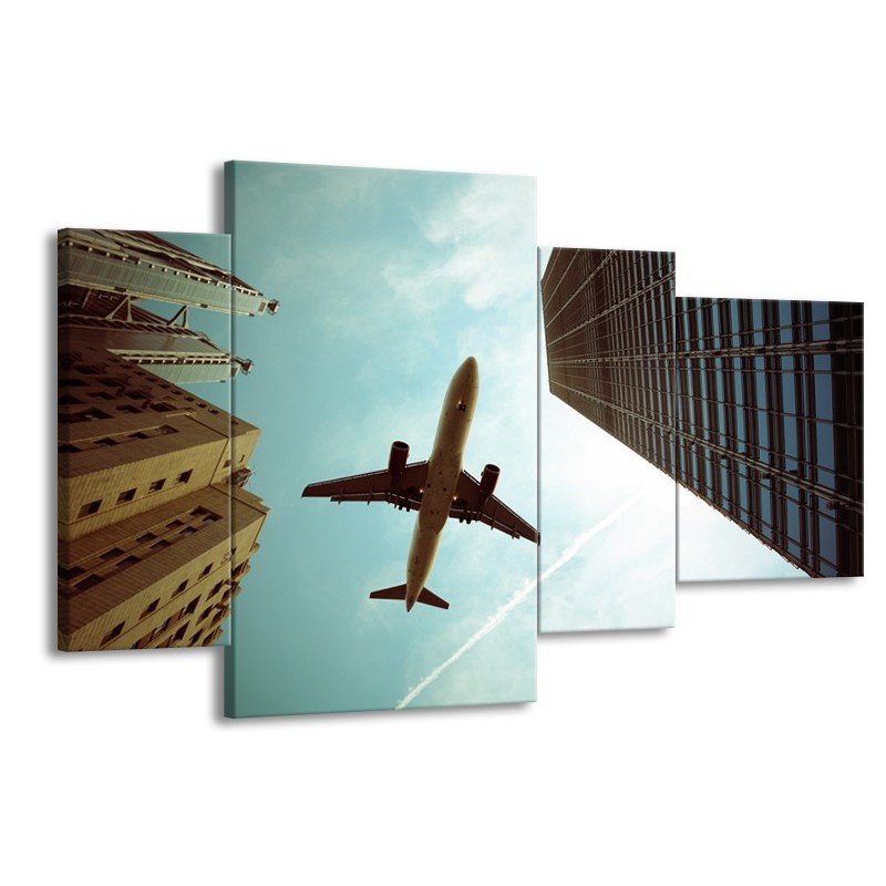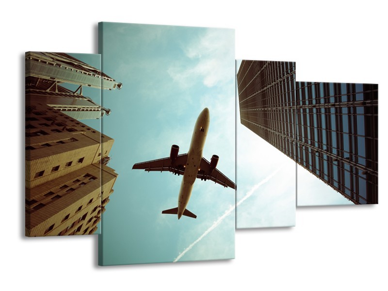 Glasschilderij Steden, Vliegtuig | Groen, Blauw, Grijs | 120x75cm 4Luik