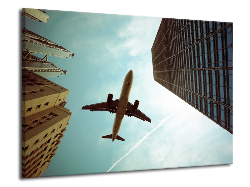Glasschilderij Steden, Vliegtuig | Groen, Blauw, Grijs | 70x50cm 1Luik