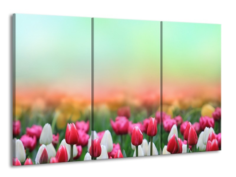 Glasschilderij Tulpen, Bloemen | Groen, Roze, Wit | 165x100cm 3Luik