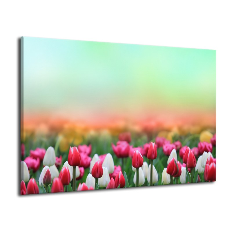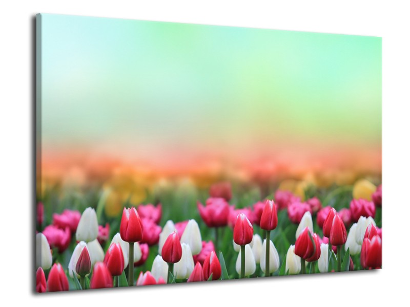 Glasschilderij Tulpen, Bloemen | Groen, Roze, Wit | 70x50cm 1Luik