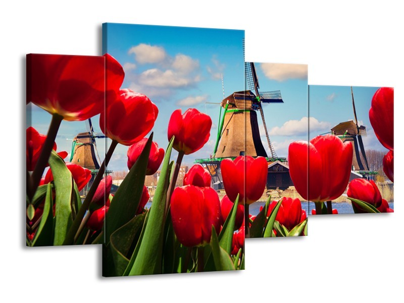 Glasschilderij Tulpen, Molen | Rood, Blauw, Grijs | 120x75cm 4Luik