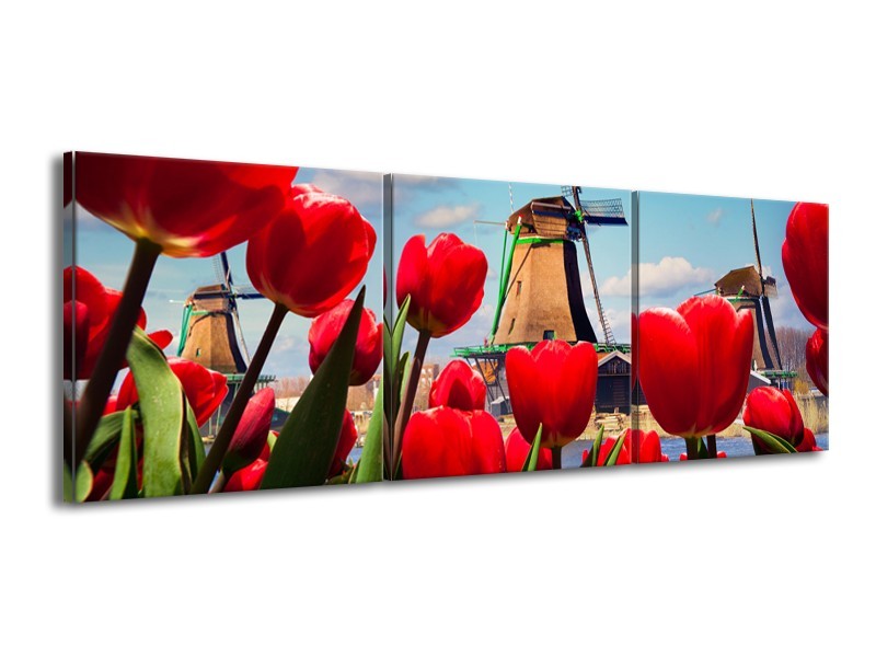 Glasschilderij Tulpen, Molen | Rood, Blauw, Grijs | 150x50cm 3Luik
