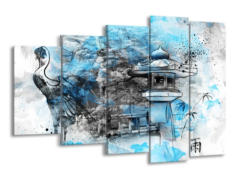 Glasschilderij Vogel, Chinese gebouw | Blauw, Zwart, Wit | 150x100cm 5Luik