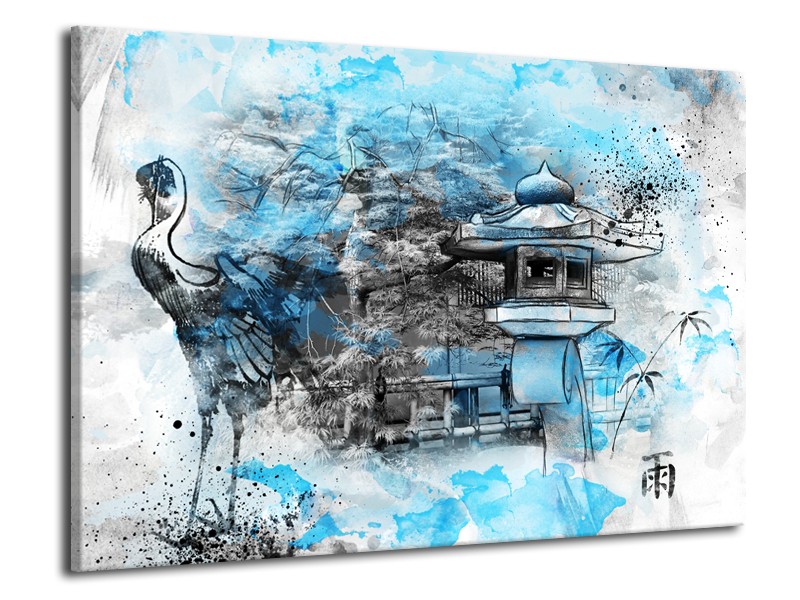 Glasschilderij Vogel, Chinese gebouw | Blauw, Zwart, Wit | 70x50cm 1Luik
