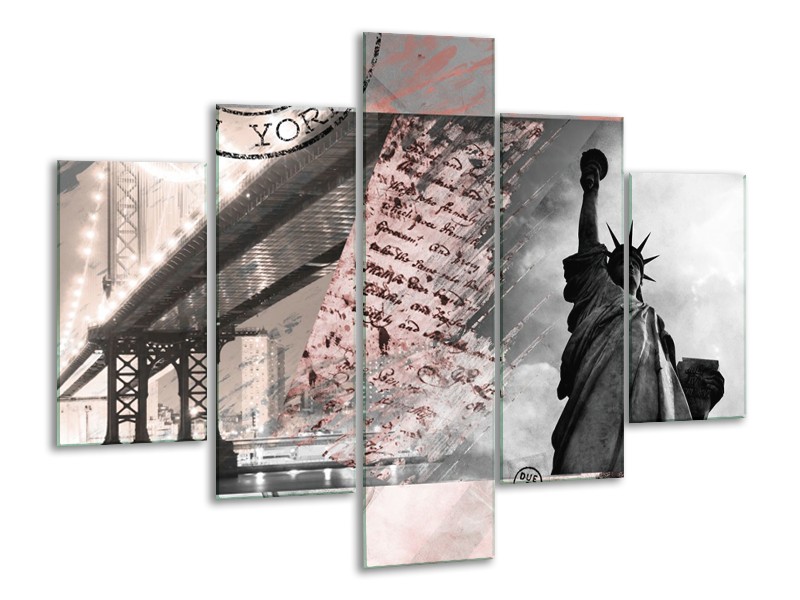 Glasschilderij Vrijheidsbeeld, New York | Grijs, Rood, Zwart, Wit | 100x70cm 5Luik
