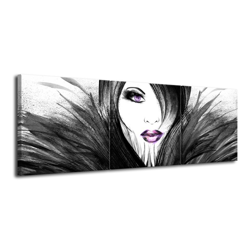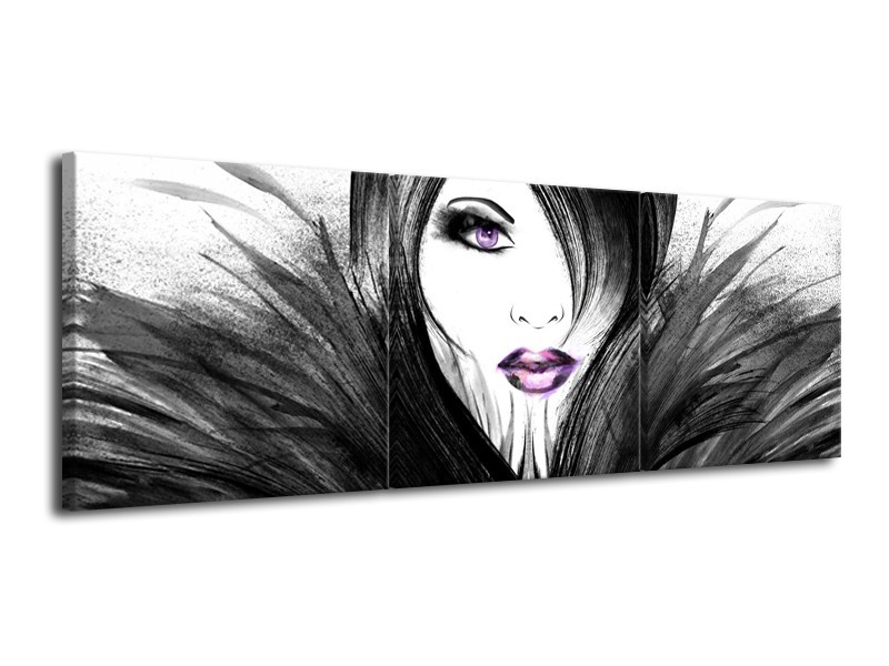 Glasschilderij Vrouw, Gezicht | Zwart, Wit, Paars | 120x40cm 3Luik