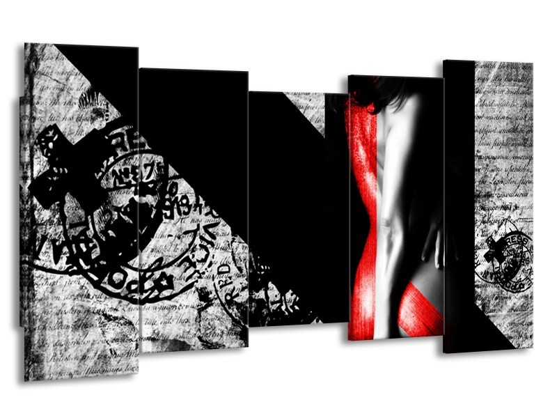 Glasschilderij Vrouw, Kunst | Rood, Zwart, Grijs | 150x80cm 5Luik