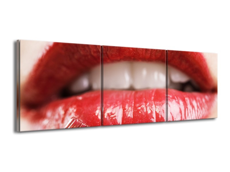 Glasschilderij Vrouw, Lippen | Rood, Crème | 150x50cm 3Luik