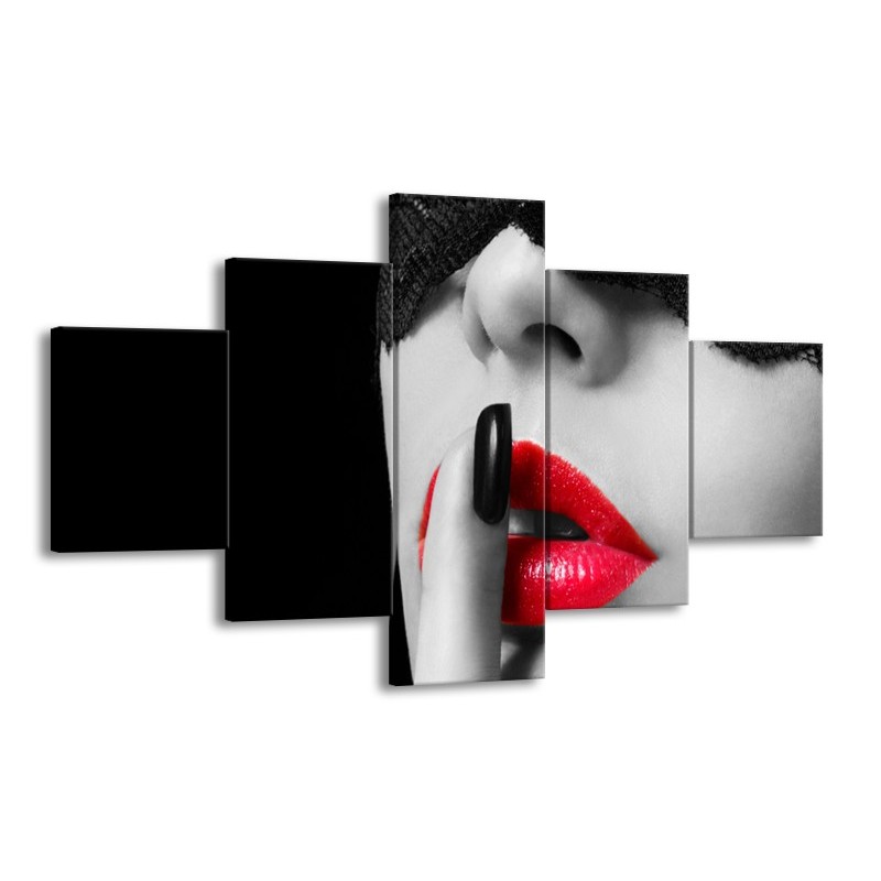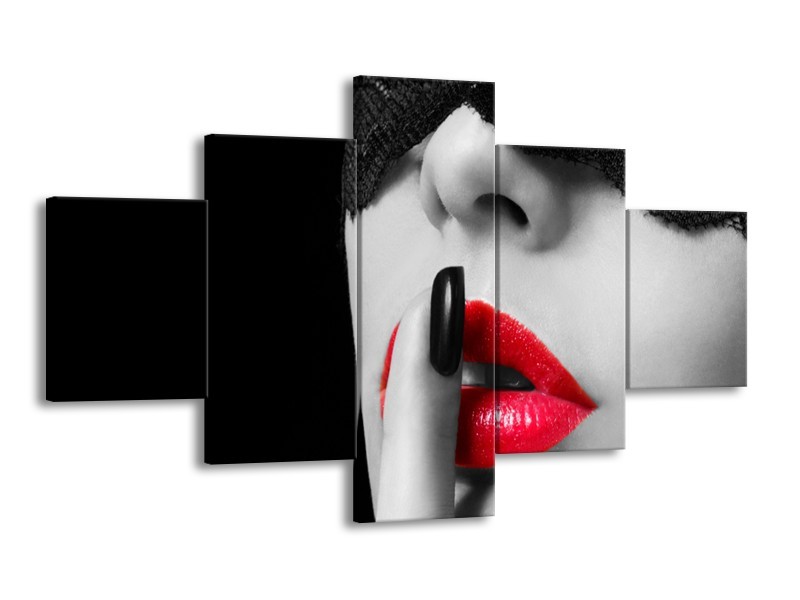 Glasschilderij Vrouw, Lippen | Zwart, Grijs, Rood | 125x70cm 5Luik