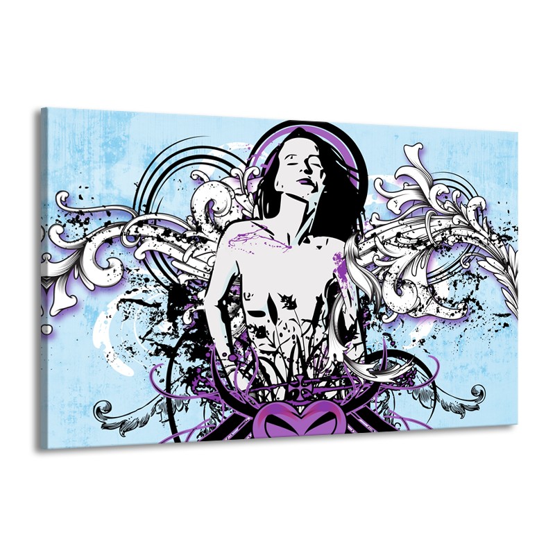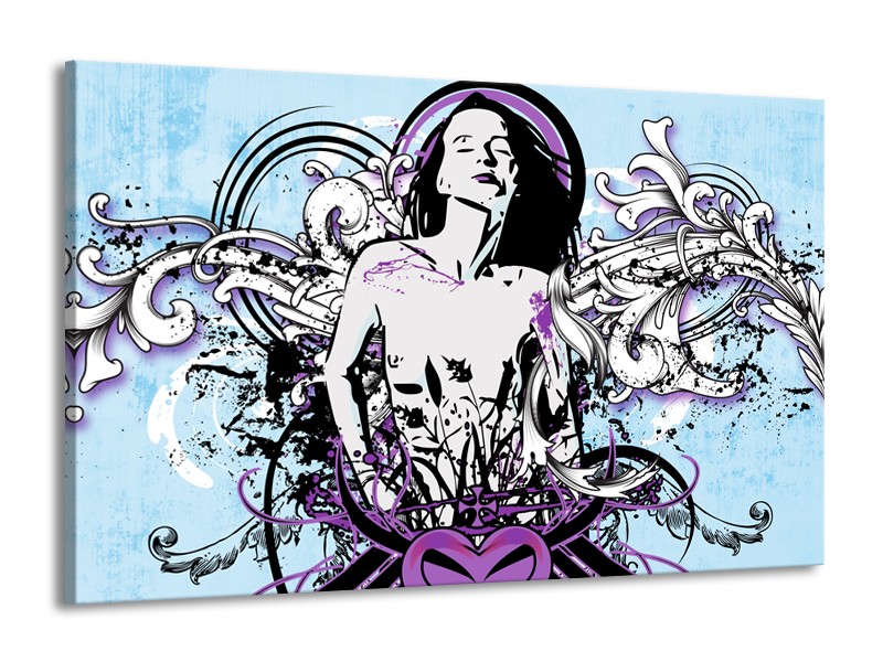 Glasschilderij Vrouw, Popart | Blauw, Paars, Wit | 140x90cm 1Luik
