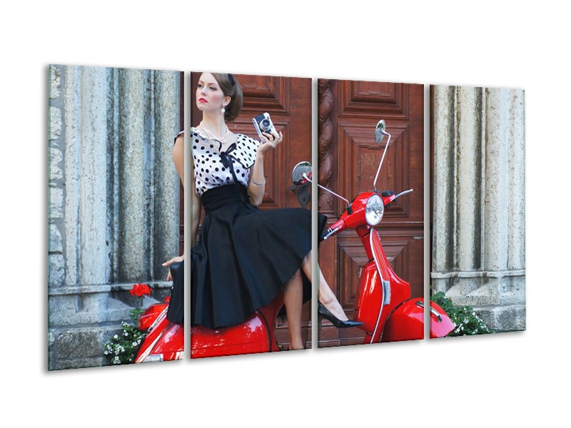 Glasschilderij Vrouw, Scooter | Rood, Zwart, Bruin | 160x80cm 4Luik